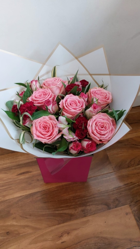 Pink bouquet made of roses, spray roses, spray carnation and alstomeria.